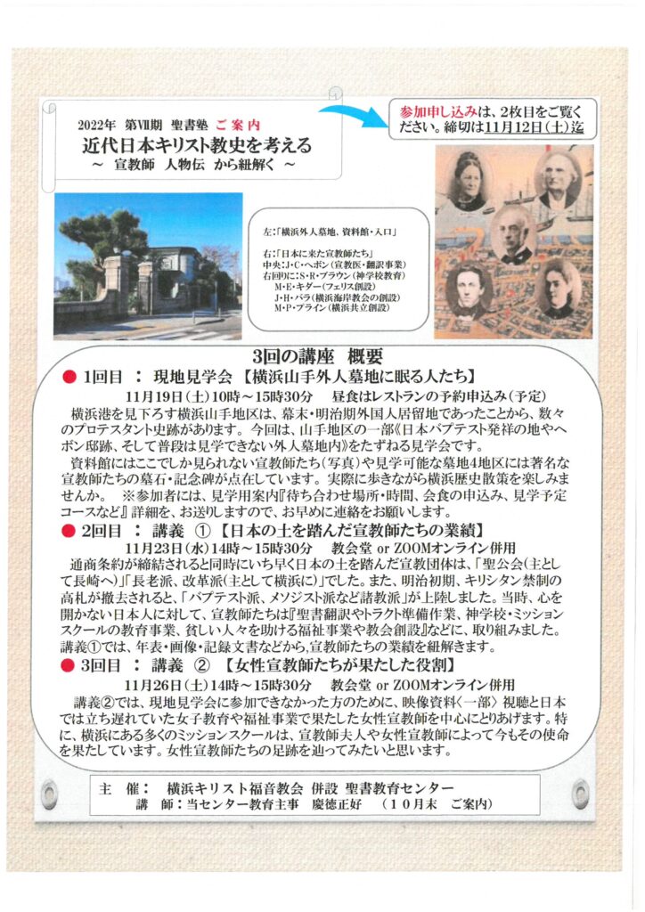 昼食はレストランの予約申込み(予定)横浜港を見下ろす横浜山手地区は、幕末・明治期外国人居留地であったことから、数々のプロテスタント史跡があります。 今回は、山手地区の一部《日本バプテスト発祥の地やヘボン邸跡、そして普段は見学できない外人墓地内》をたずねる見学会です。資料館にはここでしか見られない宣教師たち(写真)や見学可能な墓地4地区には著名な宣教師たちの墓石・記念碑が点在しています。 実際に歩きながら横浜歴史散策を楽しみませんか。 ※参加者には、見学用案内『待ち合わせ場所・時間、会食の申込み、見学予定コースなど』 詳細を、お送りしますので、お早めに連絡をお願いします。